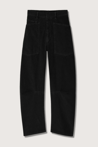 Flat front, mid-rise, relaxed fit pant in stretch corduroy. Uniquely curved silhouette. Easy gently tapered legs. Seam detail at knees. Zip fly with hidden hook and bar closure. Hidden button closure. Top-stitched front and back patch pockets. Belt loops.