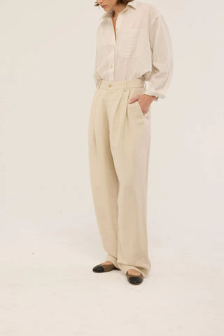 An ode to baggy and loose with deep pleats and a tapered leg. Embodying casual essence, she’s the type of trouser that you go back to. Perfect with the walking sandal and a tee shirt, acting as a workhorse for days when you need to feel professional and styled. The ideal trouser to walk the line between stylish and everyday.